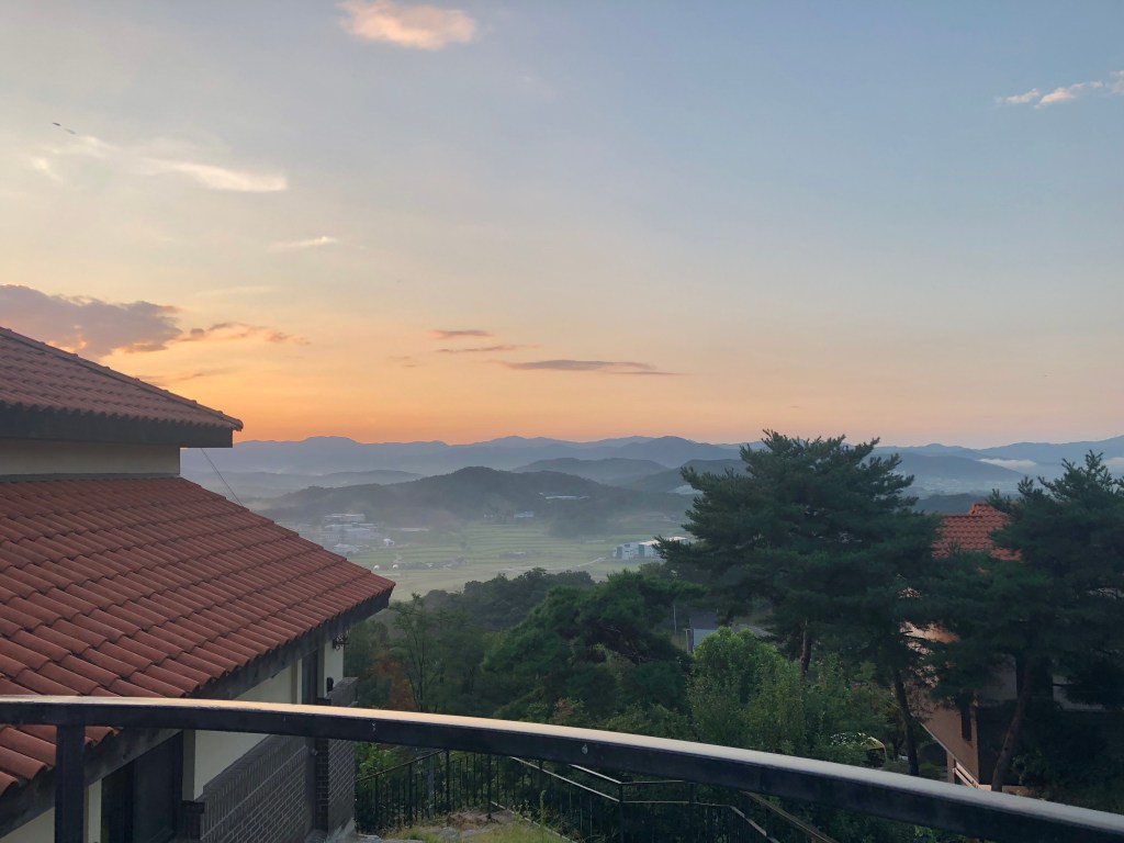 After being on the same plane for over 14 hours, it’s no surprise the exhaustion we felt, but we still had about an hour and a half ride from the airport to the school. With the darkness of night still being present, it was easy to sleep on the van most of the way. As we got closer to the school, the tall buildings started to disappear and were replaced with farm land and smaller businesses. Even though we knew it was in a small city, it was definitely what’s considered “country living” by Korea’s standards. At some point, the van started to trek up a mountain, swaying around sharp curves, and that is where we reached the school. By this time, the sun was coming up and as we were standing outside, waiting for the assistant head of the school to greet us at around 5:45 or 6 am, we took in the amazing sunrise views that introduced us to Anseong.